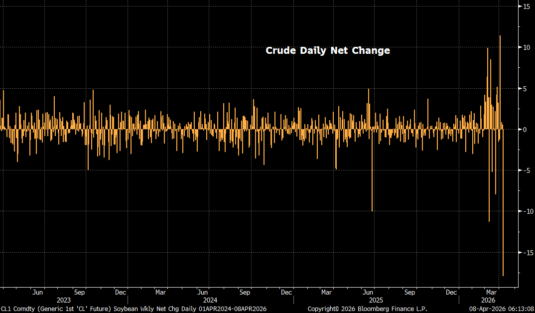 Crude is the headline. A $15–$18 drop is a pure unwind of geopolitical risk premium tied to the Strait of Hormuz. This wasn’t new supply — it was crowded positioning getting flushed.